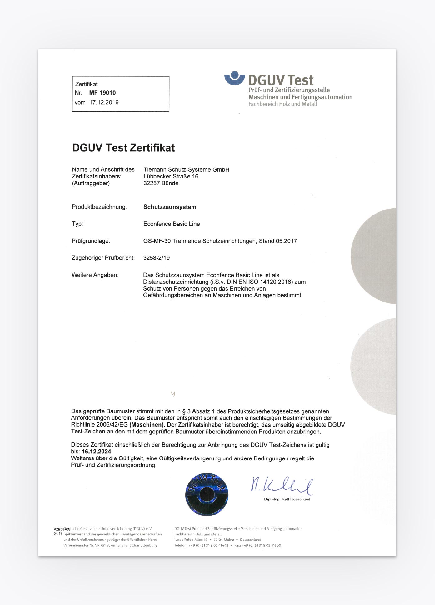 - DGUV TEST – Baumustergeprüft – Konform MRL 2006/42/EG
